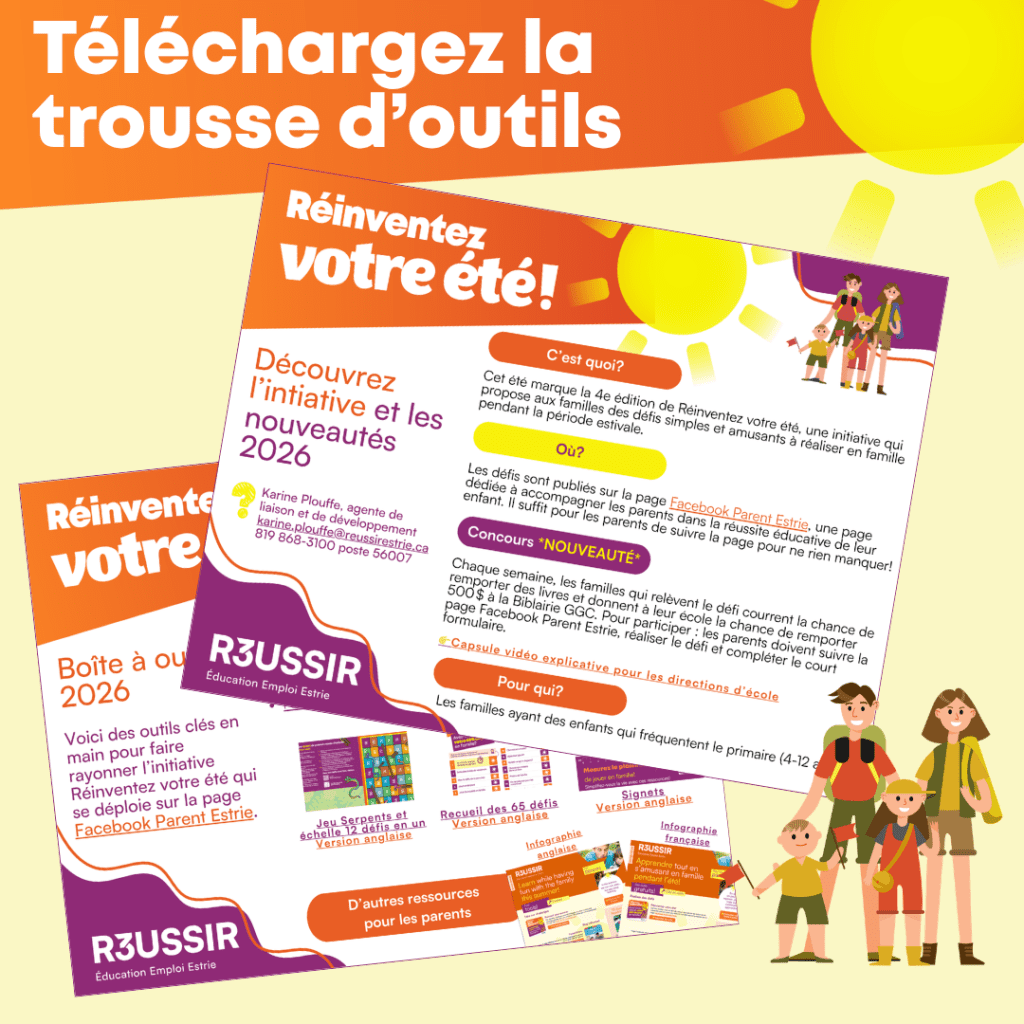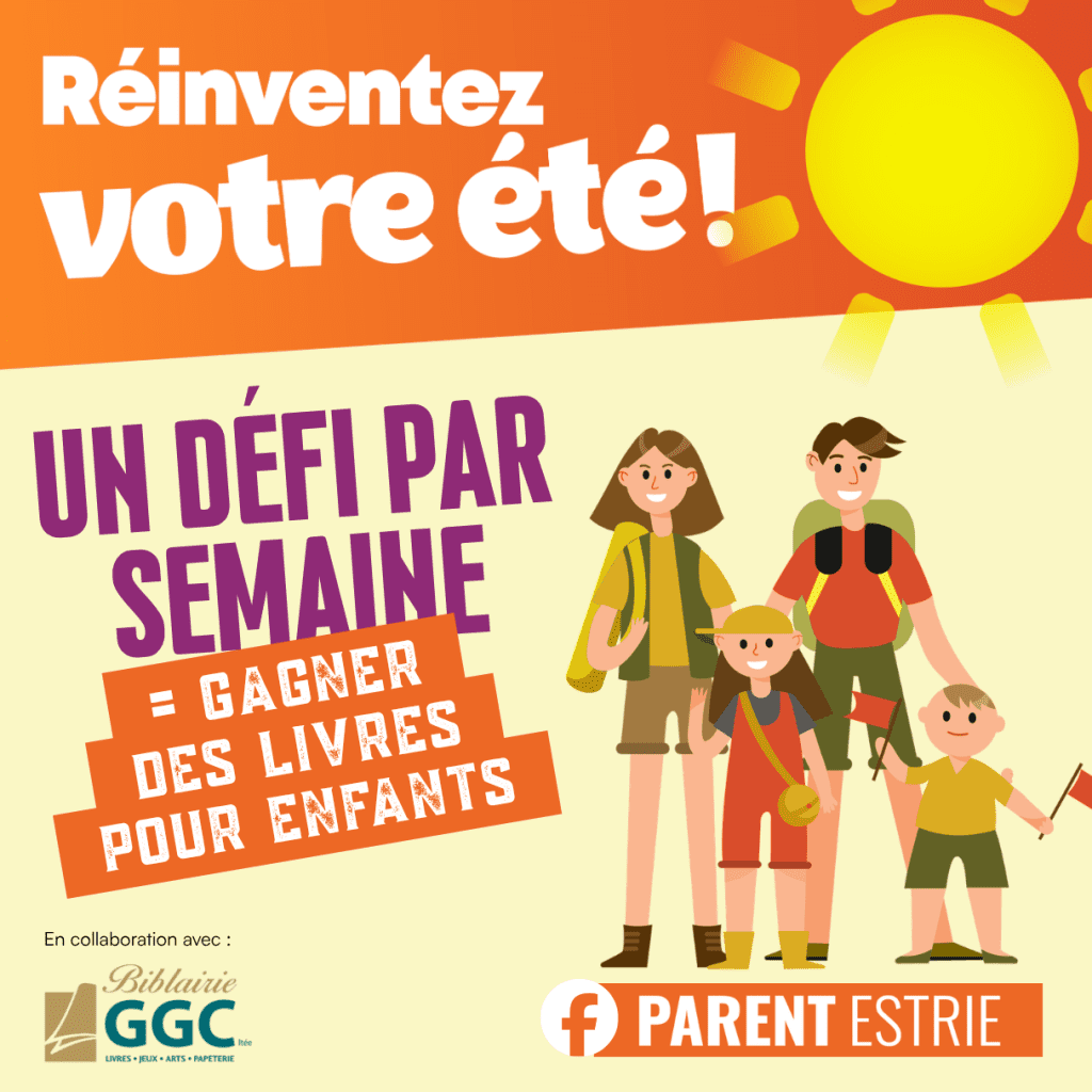 Cet été, invitez les familles avec enfants âgés de 4 à 12 ans à prendre part à l’initiative « Réinventez votre été », qui propose des défis hebdomadaires amusants et éducatifs sur la page Facebook Parent Estrie! Un défi par semaine pendant 8 semaines!